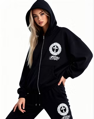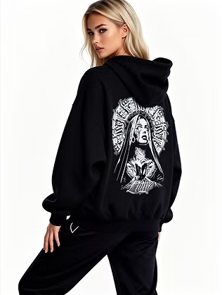 Esta campera oversize negra redefine el estilo urbano con una estética oscura y poderosa. Su estampa de virgen con detalles gráficos intensos y tipografía alternativa crea una pieza única, ideal para quienes buscan destacar con un look auténtico.