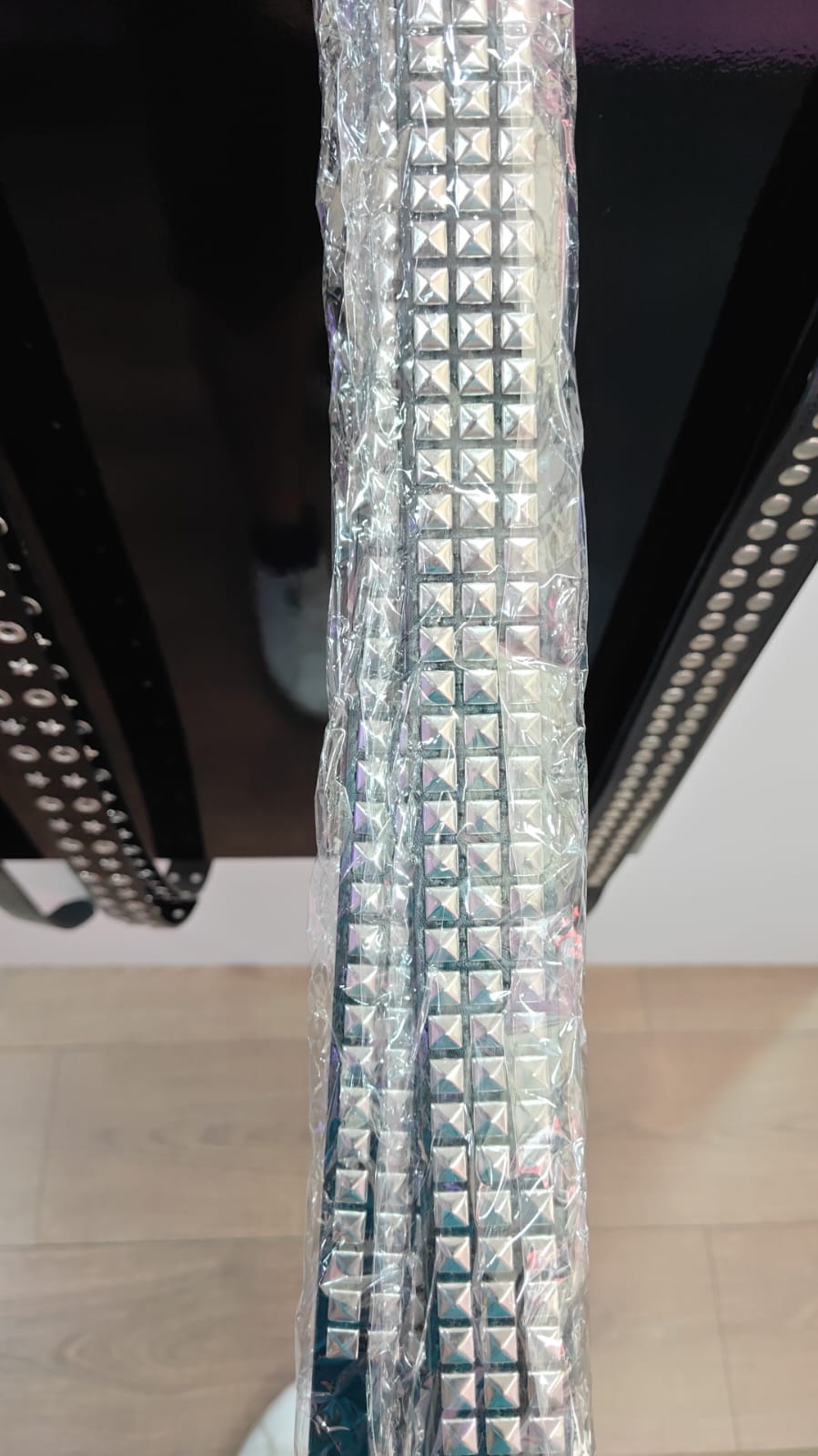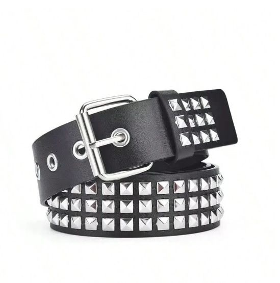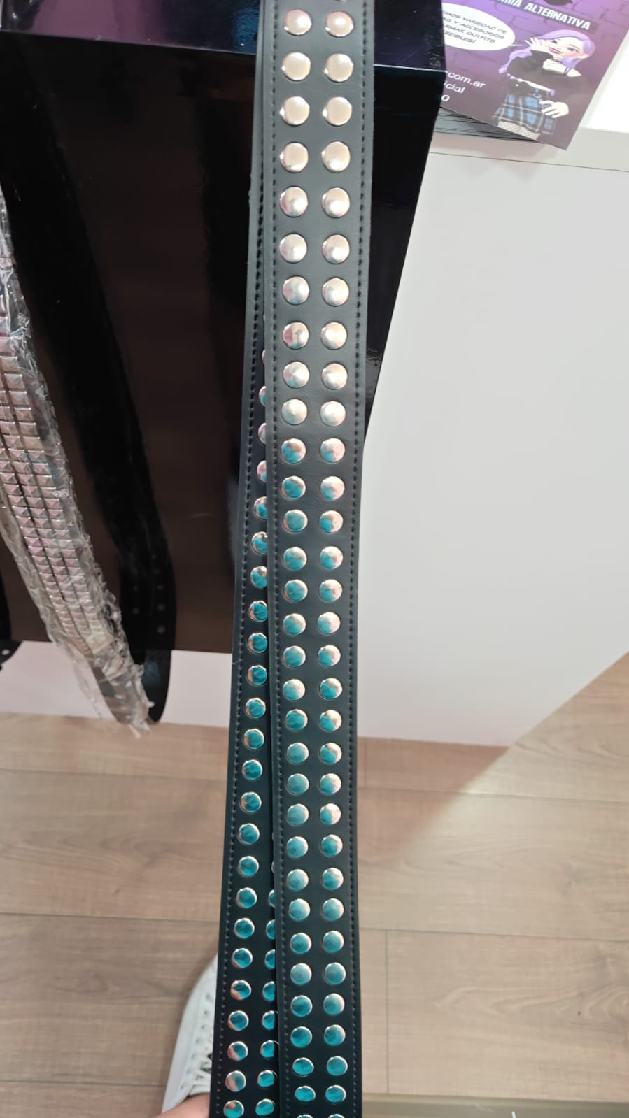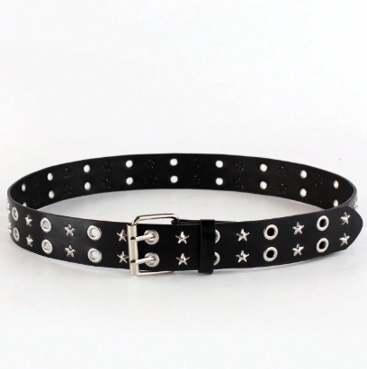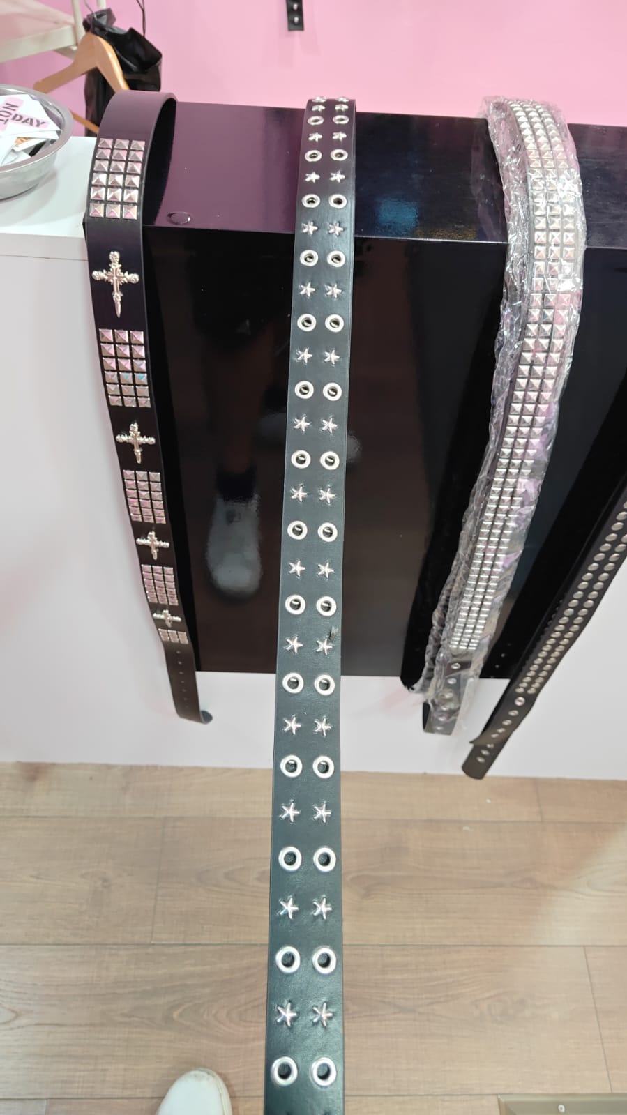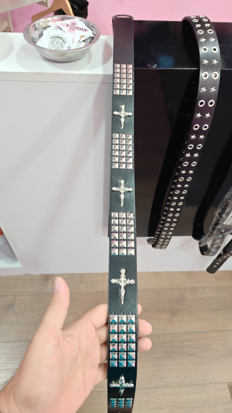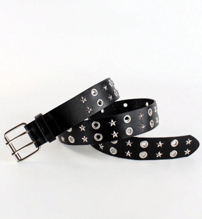 Cinto negro de ecocuero con detalles metálicos estilo punk, gótico y urbano. Disponible en diferentes variantes con tachas, ojales, cruces o estrellas.
