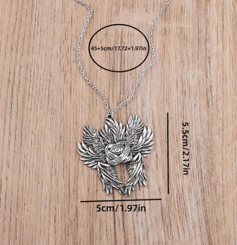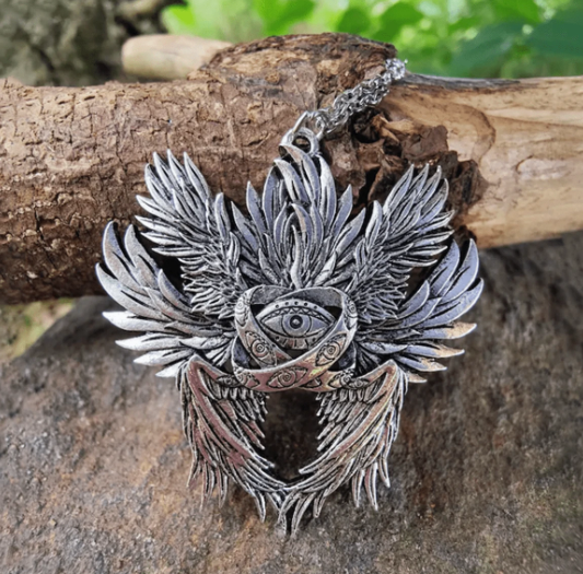 Este collar gótico combina simbología mística y estética dark en una pieza única y llamativa. Su diseño central presenta un ojo rodeado de alas detalladas, creando un efecto visual impactante que remite a lo espiritual, lo oculto y lo alternativo.