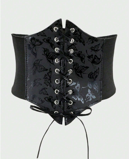 Su diseño combina un frente rígido con acabado brillante y detalles de mariposas en relieve, junto a laterales elásticos que se adaptan cómodamente al cuerpo. El sistema de ajuste con cordones metálicos permite moldear la silueta y resaltar la cintura de forma impactante.