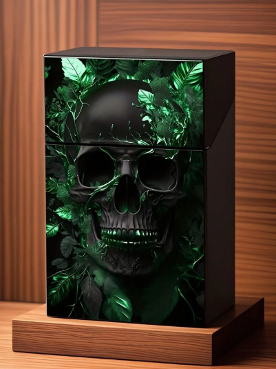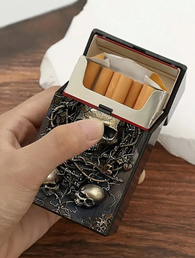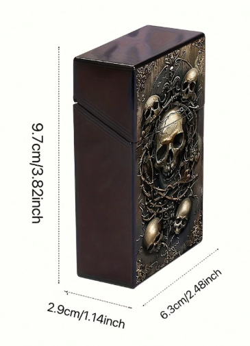 Este estuche porta cigarrillos combina funcionalidad con una estética gótica impactante. Su diseño en relieve con calaveras y detalles ornamentales crea una pieza única, ideal para quienes buscan accesorios con personalidad fuerte y estilo alternativo.