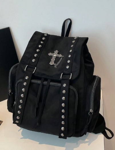 Confeccionada en material resistente con acabado negro mate, incorpora detalles metálicos que elevan su personalidad: tachas decorativas en tiras frontales y aplique de cruz metálica en la solapa.