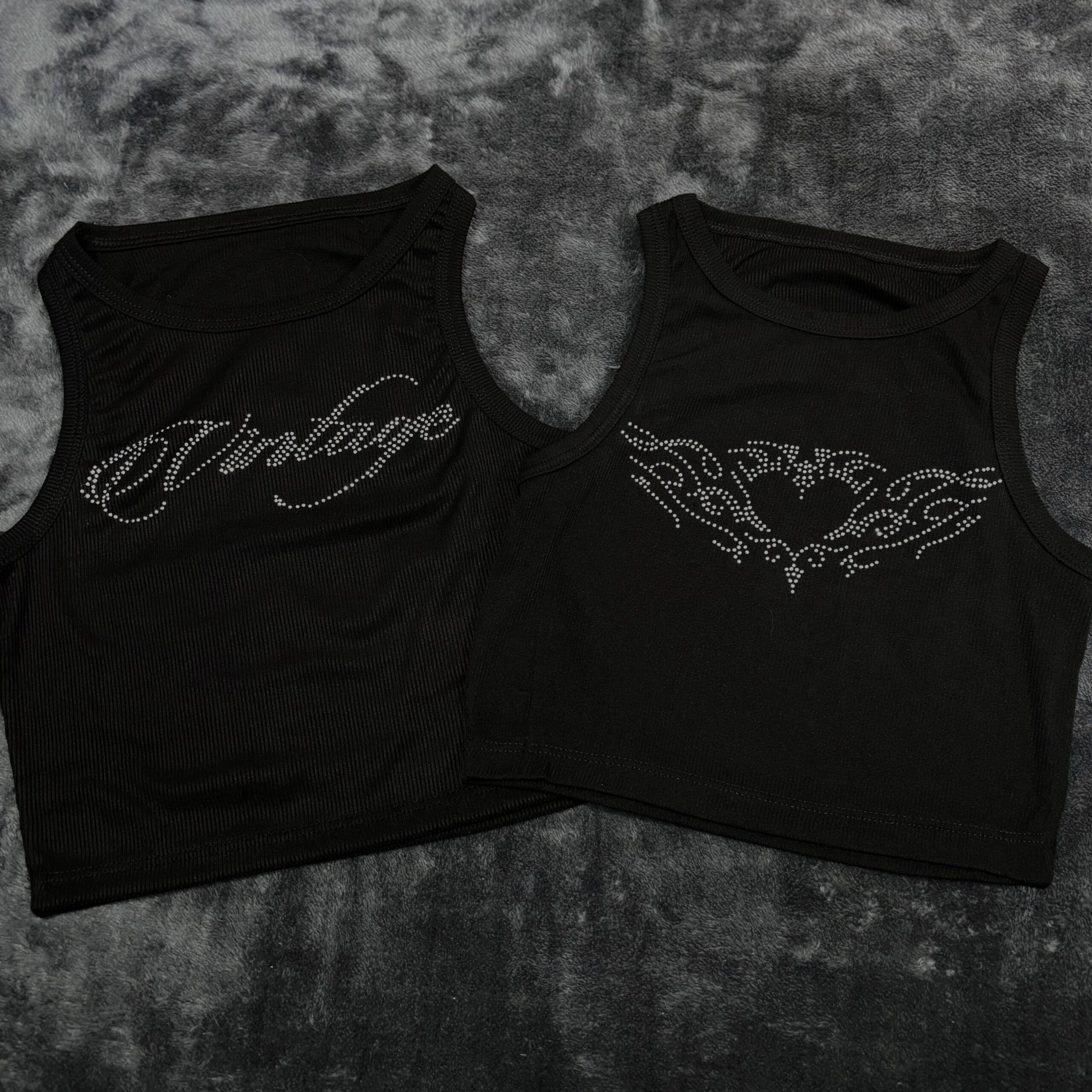 Disponible en diferentes diseños con aplicación de strass, cada estampa aporta personalidad propia: desde tipografías estilo Y2K hasta figuras tribales con detalles brillantes. El contraste del strass sobre el negro genera un efecto llamativo, ideal para outfits nocturnos o urbanos con carácter.