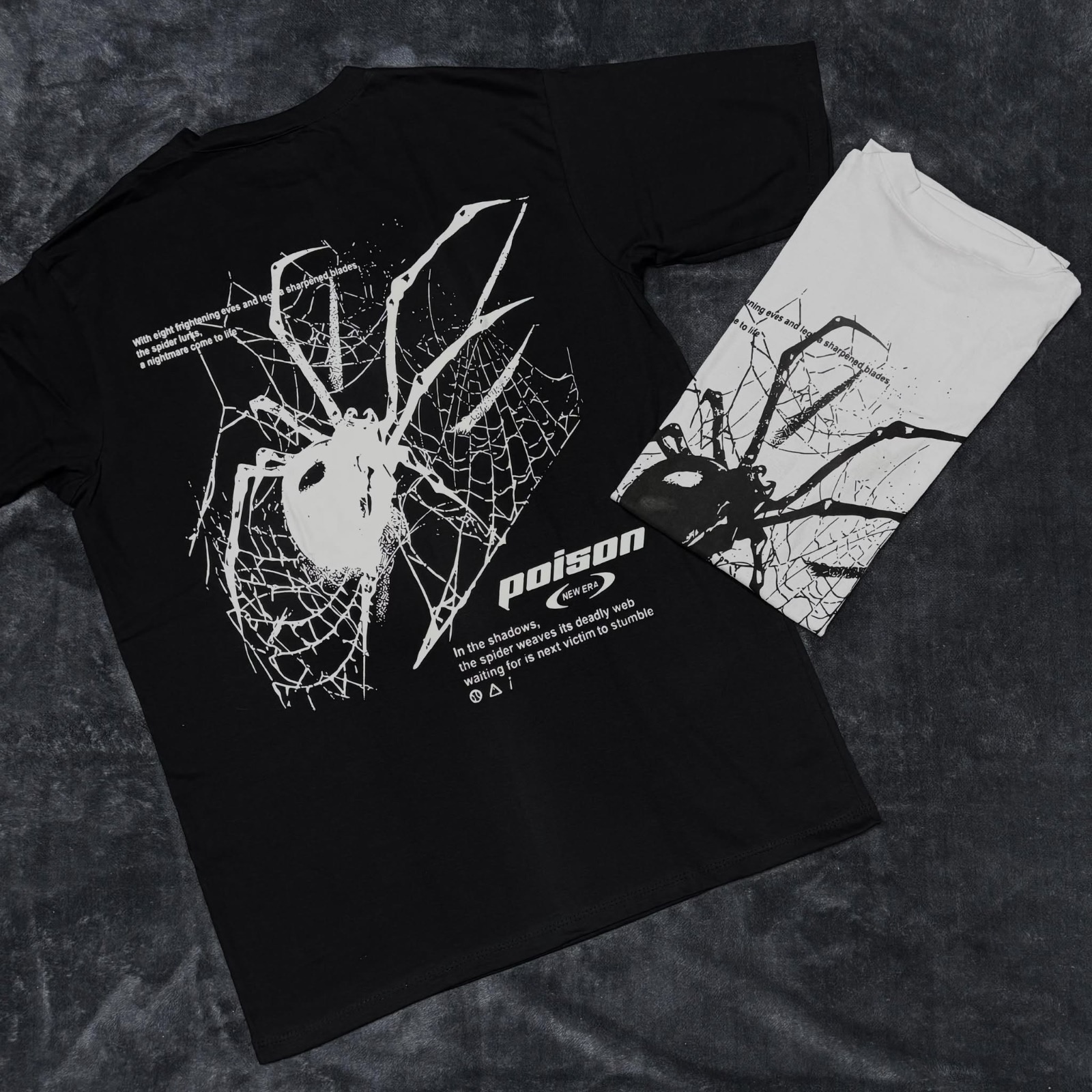 La estampa protagonista de araña y telaraña, combinada con tipografía industrial y detalles gráficos, aporta un aire grunge y street. Disponible en versión negra con estampa blanca y blanca con estampa negra, generando un contraste potente y moderno.