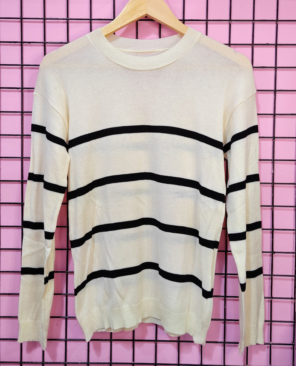 Suéter rayado confeccionado en tejido suave que aporta comodidad y abrigo con un estilo atemporal. Su diseño clásico de rayas se combina con una vibra urbana y moderna, perfecto para crear outfits versátiles tanto para el día como para la noche.La caída ligera y el tacto agradable lo convierten en una prenda ideal para el uso cotidiano, adaptándose fácilmente a jeans, pantalones holgados o looks más arreglados.Un básico infaltable que mezcla tradición y estilo urbano en una pieza práctica y moderna.