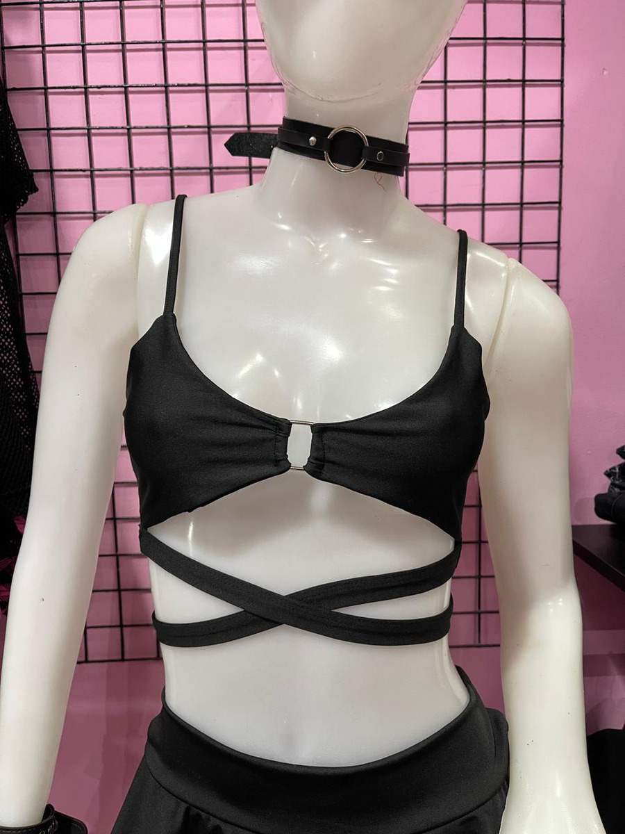 Top femenino confeccionado en lycra suave y elástica, con diseño moderno y sensual. Presenta breteles finos, escote pronunciado con detalle central y tiras cruzadas que rodean la cintura, realzando la figura y aportando un look llamativo y actual.
