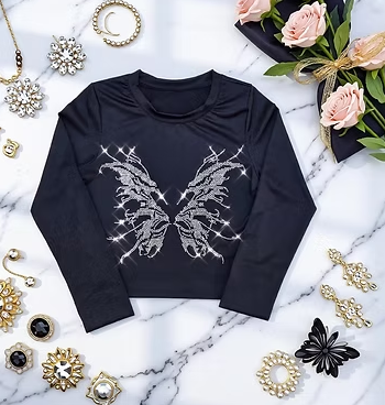 El diseño central de mariposa con strass brillantes aporta un efecto visual impactante, jugando con la luz y generando un contraste único sobre el fondo oscuro. La mariposa, símbolo de transformación y dualidad, se fusiona con una estética gótica moderna, creando una prenda delicada pero con carácter.